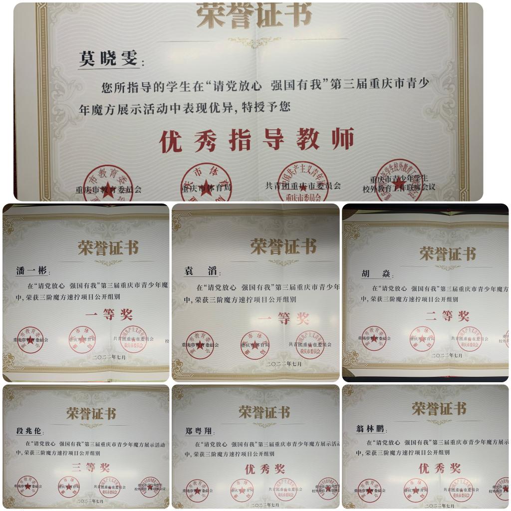 为深学笃用习近平新时代中国特色社会主义思想,强化青少年科学创新精神和实践能力,引导广大青少年培育和践行社会主义核心价值观,以实际行动迎接党的二十大胜利召开,团市委、市教委、市体育局、市校外联在6月共同举办了第三届“请党放心强国有我”重庆市青少年魔方展示活动决赛。我校魔方社积极组织参赛,最终获市一等奖2人,市二等奖1人,市三等奖1人,市优秀奖2人,莫晓雯老师被评为优秀指导老师。