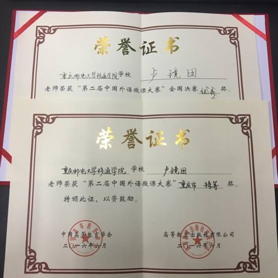 此次大赛分为各省/直辖市复赛、全国总决赛两轮评比。来自全国31个省市,包括南京大学、武汉大学等知名大学在内的500多所院校参加了本届比赛,共提交作品1540件,最终120件作品通过了复赛评审,而我校卢镜囡老师的作品也以重庆市特等奖的身份顺利入围全国总决赛。经过全国多位专家为期3个月的决赛评审,卢老师的作品最终获得全国优秀奖,这是我校老师个人参赛的最好成绩,也是此次赛事举办以来,重庆市本科英语组首个独立院校获奖,成绩可喜可贺。