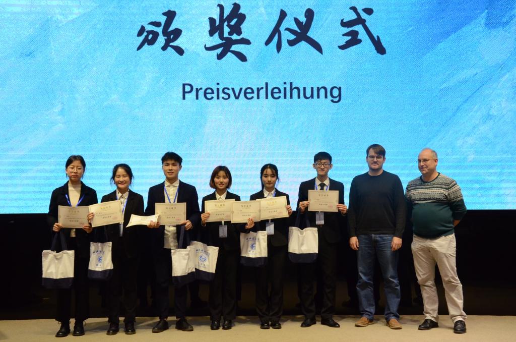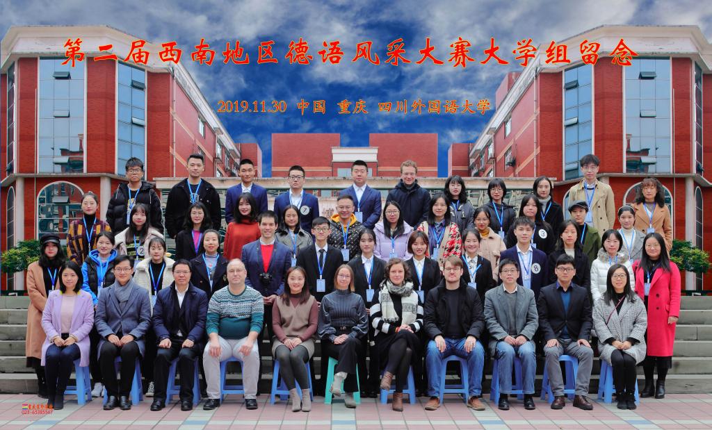11月30日早上8:45抽签,首轮主题演讲环节我们幸运的抽到了8号签。比赛开始前,首先由全国外语教学与指导委员会德语分委委员、四川外国语大学德语系主任、四川外国语大学歌德语言中心中方主任李大雪教授和DAAD(德意志学术交流中心)德方专家Sabrina Stock女士致辞。合影后,比赛正式开始,本次比赛的评委为歌德语言中心德方主任Verena Zimmermann女士、DAAD德方专家Sabrina Stock女士、川外德语外教Frank、Dominik、重庆大学德语系副主任毛亚斌博士和企业代表彭琳楠女士。