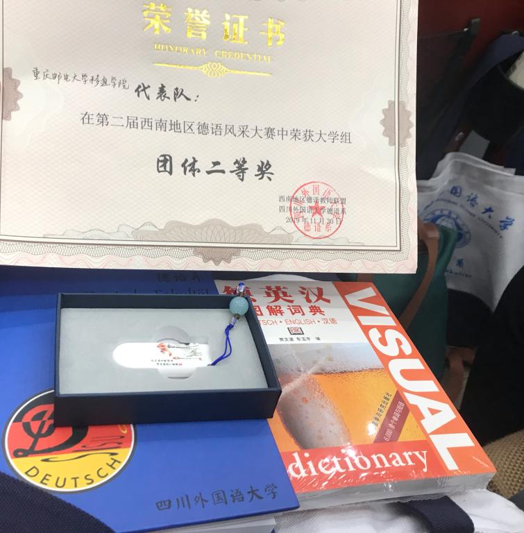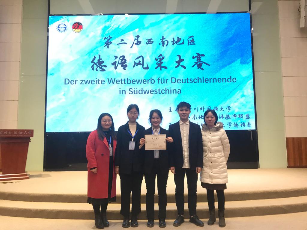 11月30日,我校外语系德语专业学生谭浩、李玉、朱文文在指导老师朱惠东和熊光源的带领下,参加四川外国语大学第二届西南地区德语风采大赛,并获团体二等奖。