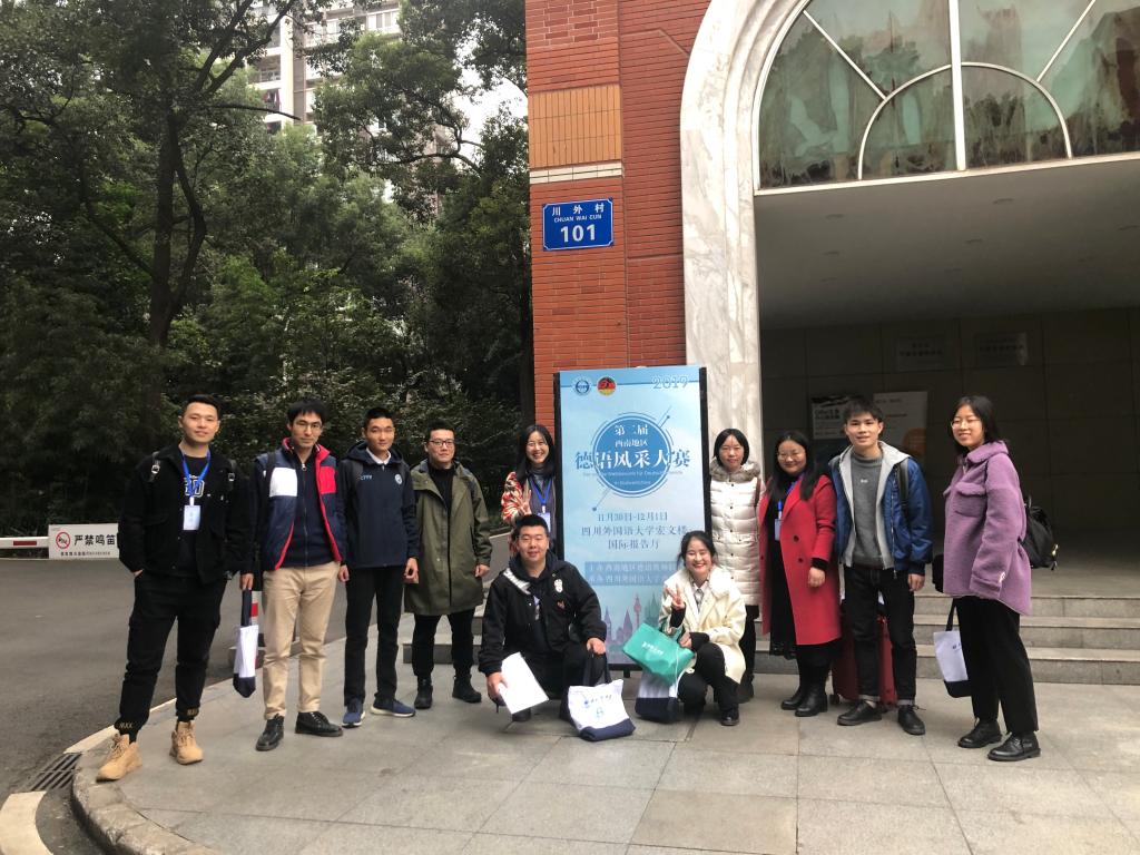 参加本次大学组比赛的学校为来自川渝地区的八所院校,包括实力强劲的主办方四川外国语大学、西南大学、川外成都学院、川外南方翻译学院、川大锦江学院、绵阳师范学院和我校的外语系与中德学院八支代表队。我校德语专业队由朱惠东老师和熊光源老师担任指导教师和带队教师,由2017级德语2班谭浩同学担任参赛队伍队长。参赛选手按照组委会要求,从主题演讲、视频配音、知识竞答、趣味猜词与才艺表演五个板块做准备。为统一大家的时间,训练时间几乎都安排在晚上进行,保持至少每两天碰面集训的形式。在主题演讲的3个题目提前两周给出后,由学生自行写稿,然后交由德语外教进行修改,再由指导老师在训练过程中打磨稿件,逐渐臻于完美。
