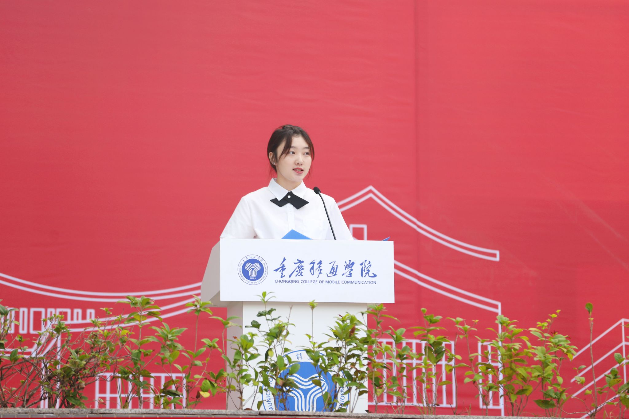 艺术传媒学院、鱼城书院2023级龚涵同学代表全体新生登台发言。她表示,作为新一代移通人,我们站在人生的新驿站——重庆移通学院这一崭新的舞台上,要接好接力棒,以拼搏、奋进的姿态,踔厉奋发、勇毅前行,与移通学院共同跑出属于新一代移通人的风采,要志存高远,成为一名胸中有理想的移通人;要勤于学习,成为一名身上有本领的移通人;要知行合一,成为一名肩上有担当的移通人。她号召全体新生在今后的生活中能够努力丰富、充实自身,在四年后回眸这段难忘的岁月,皆能扪心自问、底气十足地说:青春,无悔!