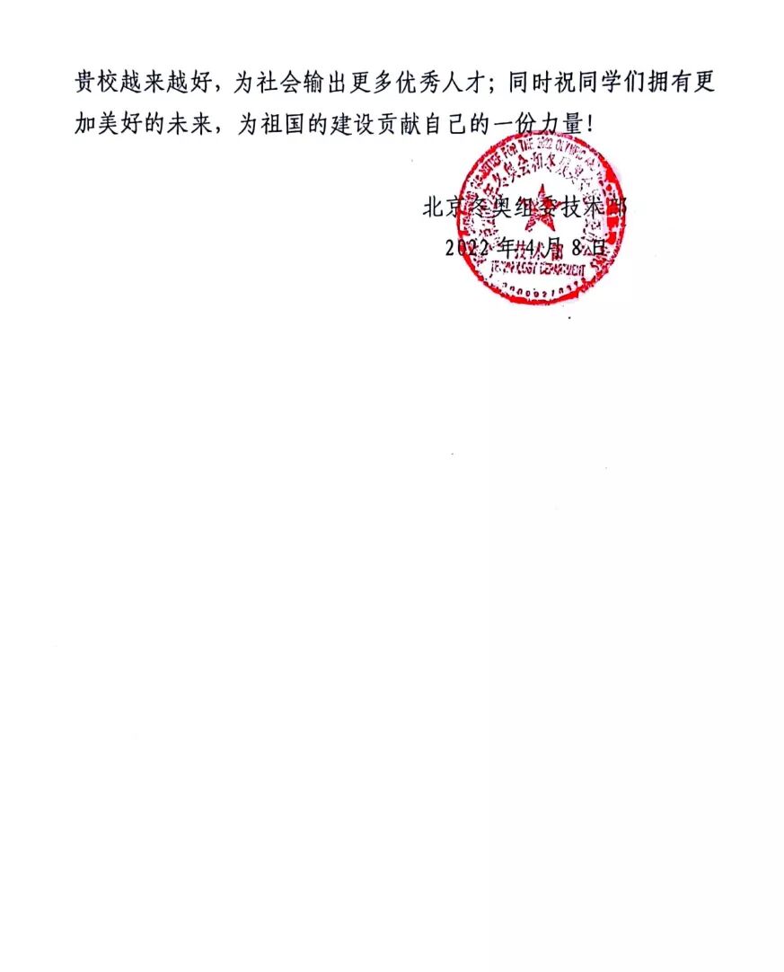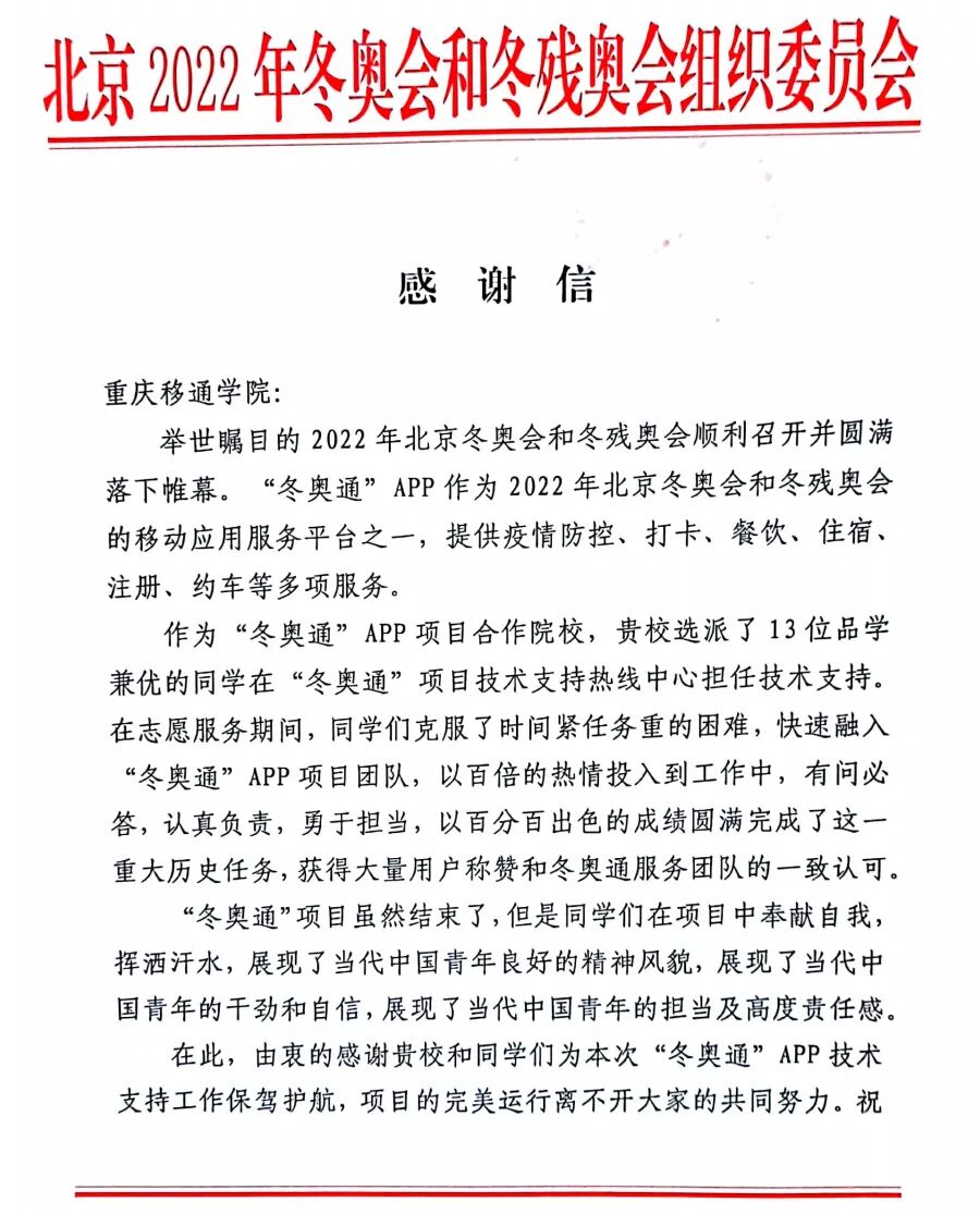 近日,我校收到来自北京2022年冬奥会和冬残奥会组织委员会的一封感谢信。信中对我校对冬奥会和冬残奥会的支持致以诚挚感谢,并对我校学子在“冬奥通”项目技术支持热线中心技术支持工作给予高度肯定。