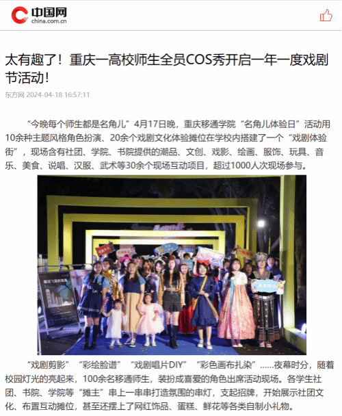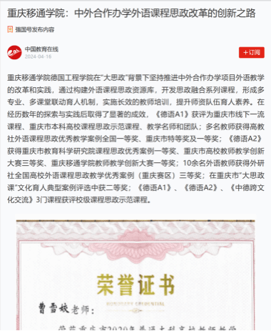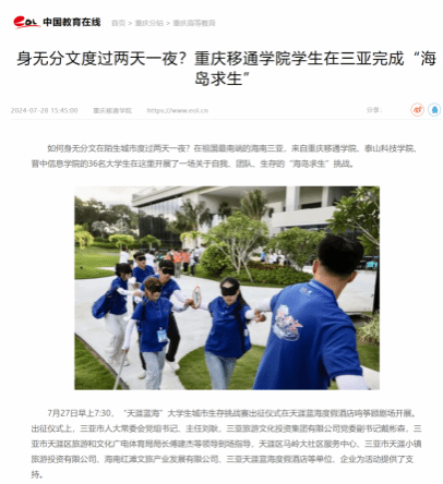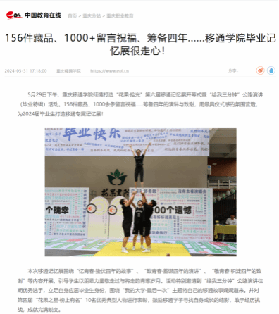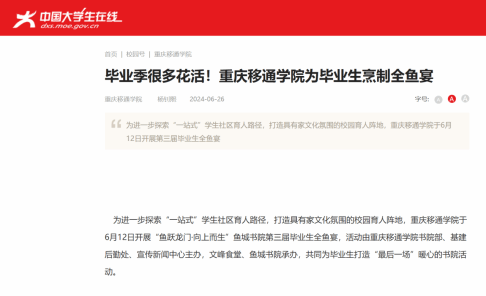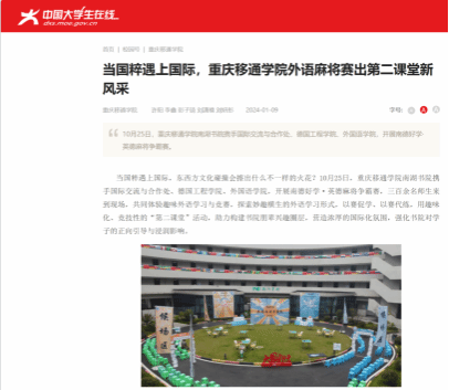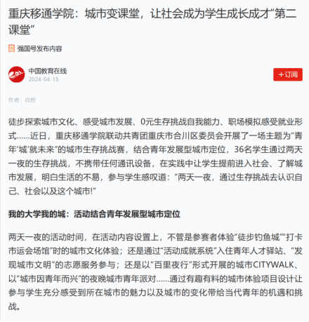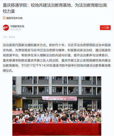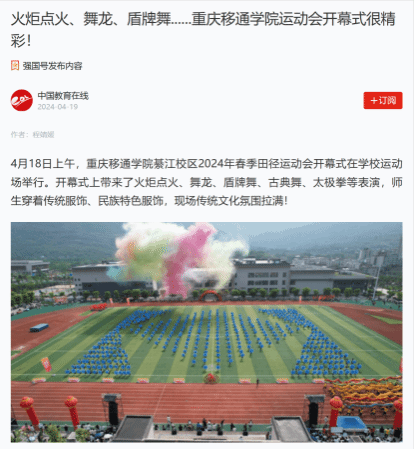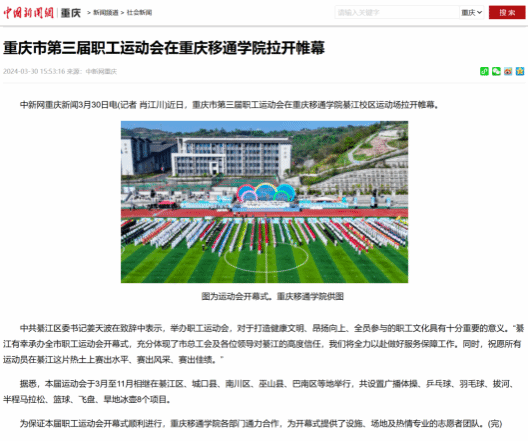迅速发展的移通受到了社会及媒体的关注与检验,移通的教育究竟为何独特?移通的人才培养究竟有何卓越成果?2024年过半,央视专访播报,学习强国多次肯定,《中国教育报》《中国质量报》《经济日报·中国县域经济报》《半月谈》《重庆日报》《海南日报》《重庆青年报》《綦江日报》等纸媒专刊报道,央广网、光明网、人民网、新华网、中国新闻网、中国青年网、中国大学生在线、中国教育电视台、重庆日报(新重庆)、华龙网、上游新闻、央广网国际在线、中国教育在线、中国网等权威媒体全方位关注,1200+篇外媒宣传可以为移通的品牌建设成果给出答案。
