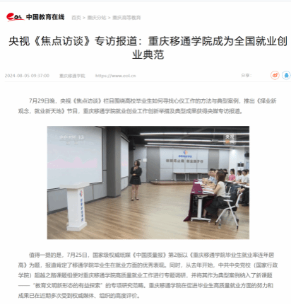 7月29日晚,央视《焦点访谈》栏目围绕高校毕业生如何寻找心仪工作的方法与典型案例,推出《择业新观念,就业新天地》节目,我校就业创业工作创新举措及典型成果获央媒专访报道推崇。节目中,我校数字媒体技术专业2024届毕业生黄雁与2011年毕业生、重庆奥盾安防科技有限公司董事长杜鹃以自身为例,分享了移通对学生就业创业的支持。我校成为就业创业典范。