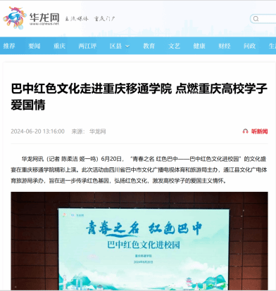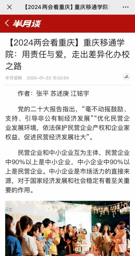1月23日,《半月谈》以《【2024两会看重庆】重庆移通学院:用责任与爱,走出差异化办校之路》为题报道我校差异化办学特色。专刊作为两会全体与会代表、委员参阅材料,展现重庆移通学院独特、优质的办学理念和成果。