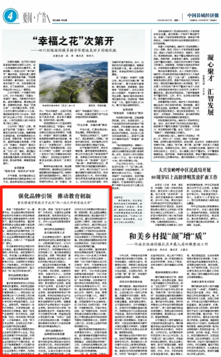 5月27日,《经济日报·中国县域经济报》以《强化品牌引领 推动教育创新 重庆移通学院致力于成为“双一流之外的首选大学”》为题,介绍我校全新品牌价值主张及办学愿景。