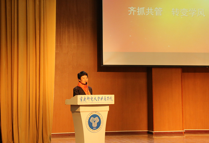 大会上,教学督导代表邓玲教授向在座师生详细介绍了教学督导办公室关于本学期学生到课率的最新数据。2013级到课率50.18%,2014级到课率为85.09%,2015级到课率为86.79%,2016级到课率为90.09%。全校平均到课率为87.32%,相比于去年增长了近八个百分点,表明学风建设成效明显。同时,邓教授关于学风不足的方面也做出了总结,归之为四个方面:上学不进校,进校不到课,到课不听课,听课不做工。她表示,学风建设是个常抓不懈的问题,辅导员和相关老师应该具备“责任心” 、“爱心”、“耐心”三心,努力抓好学风建设问题。