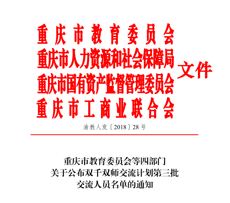 “双千双师交流计划”是根据《重庆市教育委员会等五部门关于印发双千双师交流计划实施方案的通知》(渝教职成发〔2017〕3号)精神,由重庆市教委、市人力社保局、市国资委、市工商联等部门共同组织实施的一项人才交流项目。该项计划预计在“十三五”期间,围绕重点支柱产业、战略性新兴制造业和新兴服务业、现代特色效益农业等产业发展需求,在全市范围内,每学期选派100名职业院校优秀教师赴企业担任技师或工程师,选派100名企业优秀技师或工程师赴职业院校担任专业教师,每学年选派400名人员(教师200名、企业人员200名),5年累计选派交流2000名相关人员。通过双向交流,旨在激发优秀专业技术人才和高技能人才在生产、教学、科研一线上的创新创造创优潜能,强化职业教育实践教学环节,提高技术技能人才培养质量,为实施创新驱动发展战略提供高素质技术技能人才和工匠支撑。