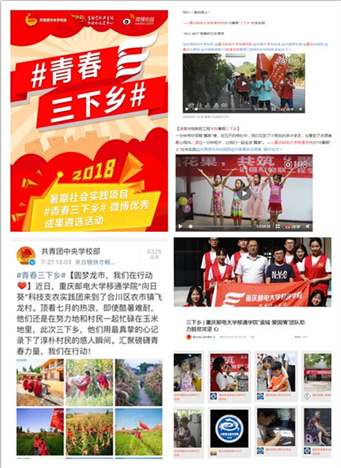 2018年是我校在1246+志愿服务2.0体系下探索实施“招投标”形式开展暑期“三下乡”的第2年,经各院系申报答辩、校团委审核、团市委批准,全国三下乡网站报备共组建23支实践团队。活动期间,校团委志愿服务版块创新宣传方式、方法,通过前期,分设各队伍宣传小组进行系统培训;中期,活动期间每天同步更新和跟进三下乡宣传工作;后期,成立宣传资料整合小组,联动各队伍开展“实践归来话成长”宣传工作。2018年8月,我校317名三下乡志愿者积极参与微博话题讨论,期间发布三下乡相关微博数1380条,微博浏览量超20万+,移通学子实时聚焦传播“青春大学习,奋斗新时代”优质内容,多条内容被团中央学校部、重庆共青团及其他省市级共青团微博转载、点赞,极高的传播度营造了良好的微博宣传氛围,也在参与“2018年暑期社会实践全国青春三下乡微博优秀成果遴选活动”的千余高校中形成了强大影响力!