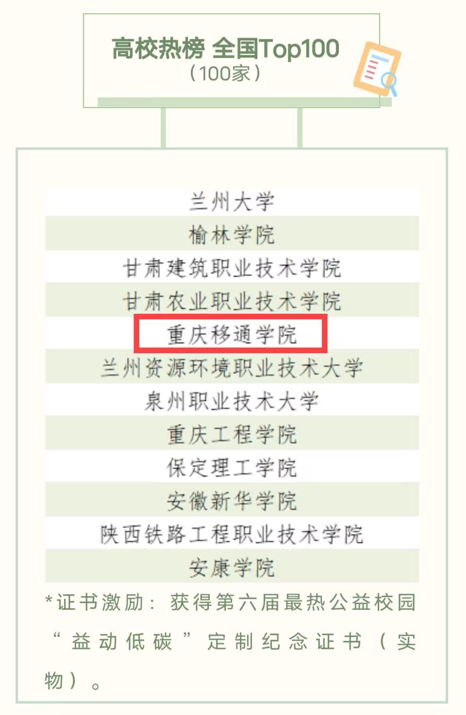 为学习践行党的二十大精神,坚持绿水青山就是金山银山的理念,推进生态文明建设,鼓舞青年学子积极争做“生态理念的传播者”“低碳生活的践行者”“绿色发展的推动者”“美丽中国的建设者”,我校以志愿汇第六届最热公益校园“益动低碳”主题活动为载体,开展特色活动,从全国500多所高校中脱颖而出,位居全国高校热榜前五十名,荣获“益动低碳”优秀组织奖。