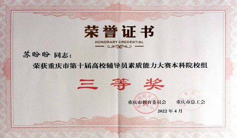 4月25日至27日,经过三轮激烈比拼,我校通信与信息工程学院辅导员苏盼盼从重庆市第十届高校辅导员素质能力大赛的50位本科院校参赛辅导员中脱颖而出,获得本科院校组三等奖。