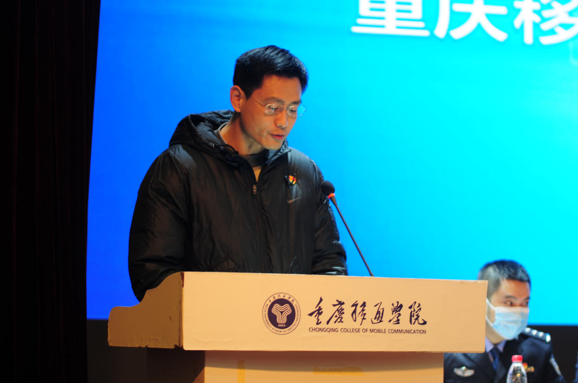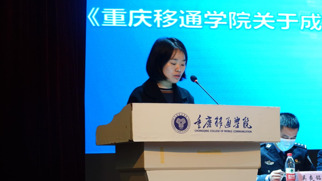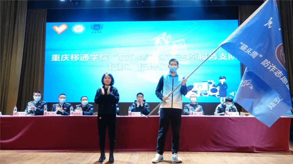 我校团委副书记谢银平宣读《重庆移通学院关于成立防诈骗专项志愿服务支队的决定》,对重庆移通学院“猫头鹰”防诈志愿服务支队进行授旗。谢书记希望该支队在未来能够始终牢记支队建设的初心和使命,将志愿服务精神运用到校园防诈的各项活动中,让移通的志愿者筑成防诈保护网,让移通的每一位学子受益。