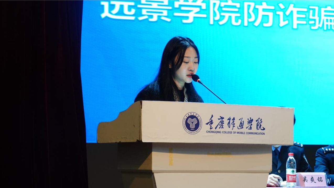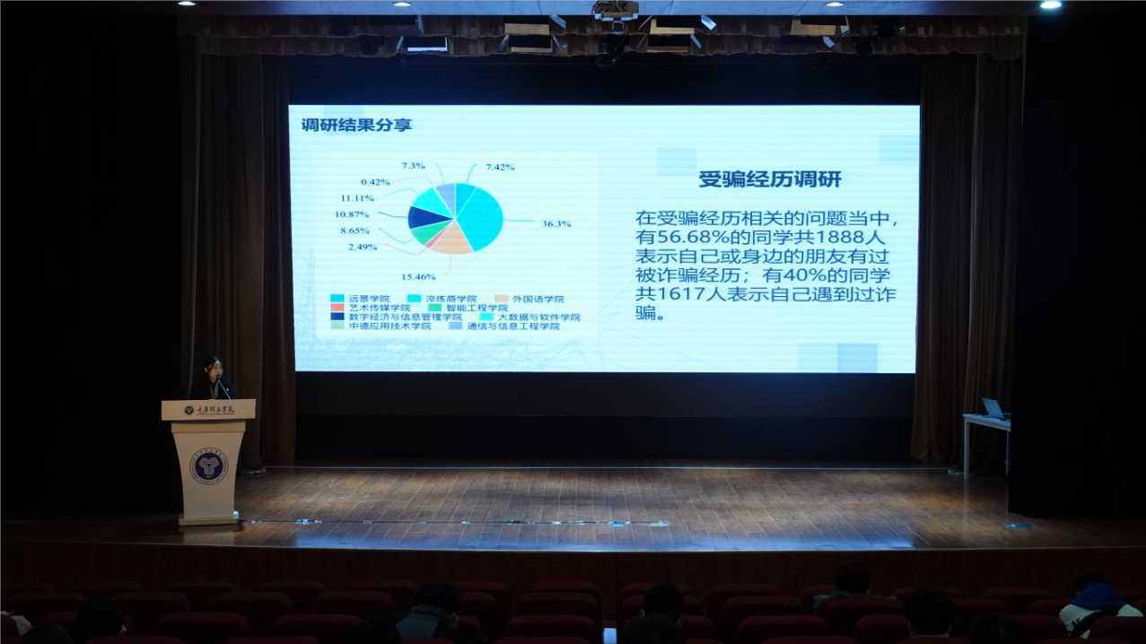 重庆市合川区公安局党委委员,刑警支队支队长孙磊警官结合真实案例及数据,向师生们普及网络刷单、网络购物、网络交友、出售二手装备、冒充熟人、冒充公检法等常见诈骗手段。他表示,合川区公安局将持续深化与校团委的联动,加强对校园防诈骗专项志愿服务支队的指导,定期研究反诈骗宣传工作的规划,加强对志愿者的业务培训,充分发挥青年大学生在反诈宣传志愿服务工作中的积极作用。