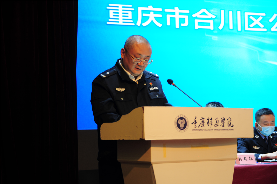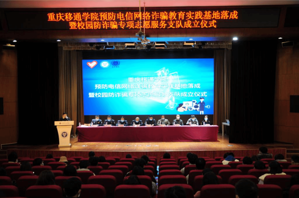为进一步加强校园防诈骗安全教育,有效提升广大青年大学生的诈骗防范意识,我校于12月15日上午10点在下里巴人剧场召开预防电信网络诈骗教育实践基地落成暨校园防诈骗专项志愿服务支队成立仪式。重庆市合川区公安局党委委员,刑警支队支队长孙磊;重庆市合川区刑警支队副支队长陈春风;重庆市合川区刑警新型犯罪侦查大队大队长付沛;重庆市合川区刑警新型犯罪侦查大队副大队长吴爽铭以及重庆移通学院副校长周伟、校长助理尹浩亮等相关领导出席会议。