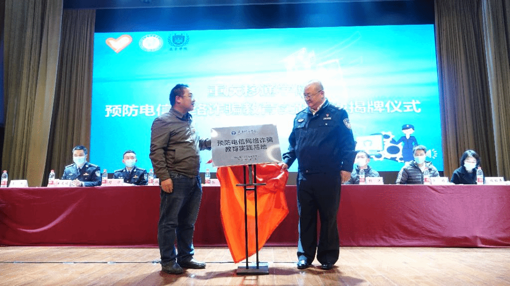 随后,合川区公安局党委委员,刑警支队支队长孙磊警官与我校校长助理、党委委员、纪委书记尹浩亮共同为“重庆移通学院预防电信网络诈骗教育实践基地”揭牌,这也预示着在今后的防诈骗工作中将加强警校互动,共同做好学校的防诈骗工作,学校志愿者们也会配合合川区反诈中心做好相关志愿服务活动。