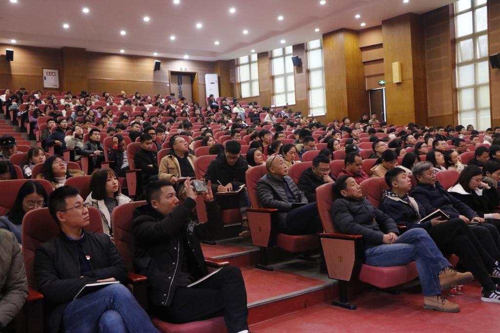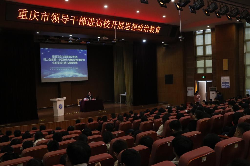 为深入学习宣传贯彻习近平新时代中国特色社会主义思想,认真贯彻落实全国高校思想政治工作会议精神,推动领导干部上讲台开展思想政治教育工作落实、落地,积极配合市委、市政府有关安排,经过精心筹备,于12月12日下午,重庆市委网络安全和信息化委员会办公室主任、重庆市互联网信息办公室主任文天平走进重庆邮电大学移通学院,为大家带来题为“把握信息化发展历史机遇——努力在实现中华民族伟大复兴的中国梦的生动实践中放飞青春梦想”的思政教育主题报告。报告会由我校党委书记苏开荣同志主持,校长张德民等校领导、党委委员、二级单位党政主要负责人、思政课教师、辅导员和师生代表等共计400余人参加听课。