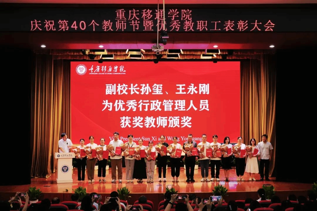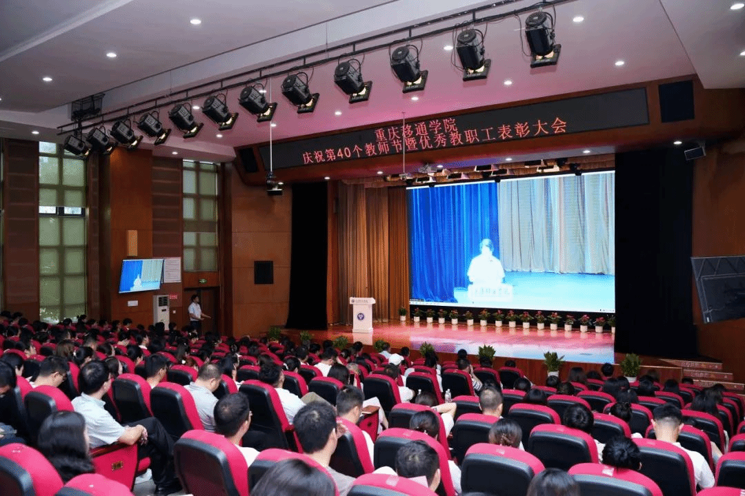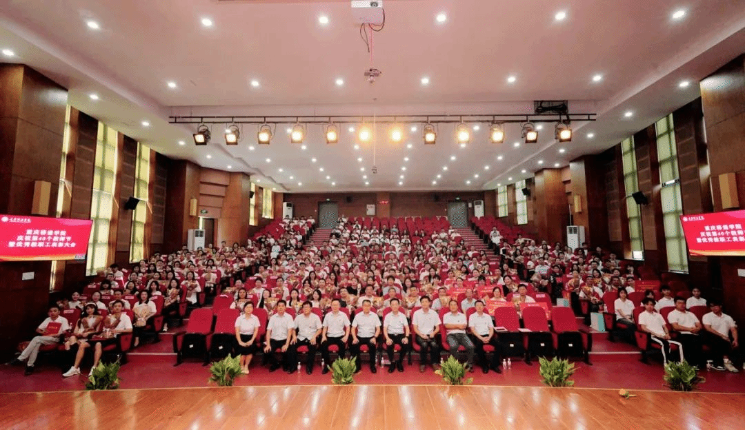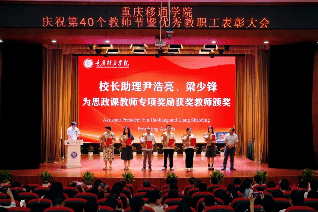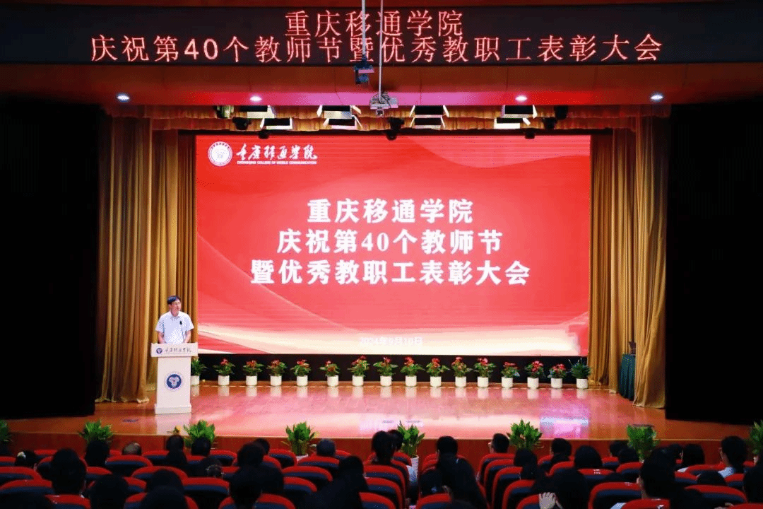 9月10日,我校在合川校区下里巴人剧场、綦江校区綦艺大剧院同步召开庆祝第40个教师节暨优秀教职工表彰大会。全体在家校领导、各二级单位负责人、科级及以上管理干部、教研室负责人、团总支书记、学工办主任、就业办主任、行政主管、书院执行院长、综合办公室主任、团委中心主任、双体软件精英产业学院经理、受表彰教师、教师代表以及全体新进教师出席了大会。