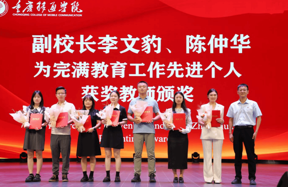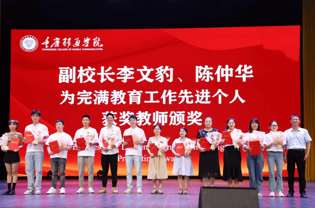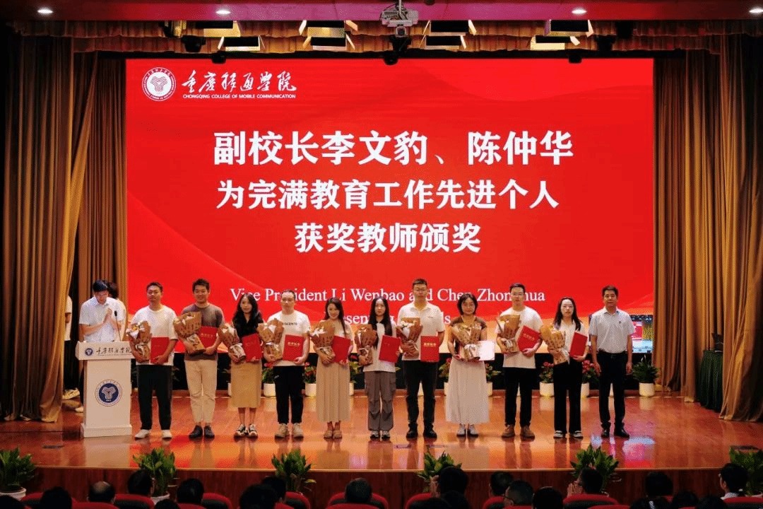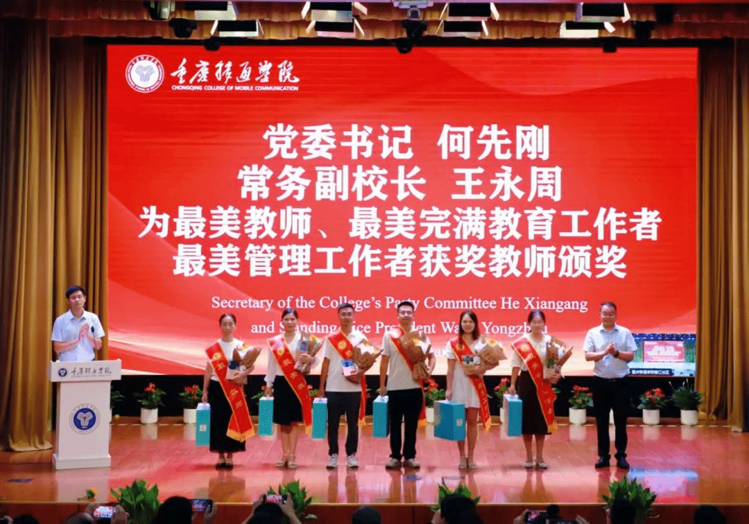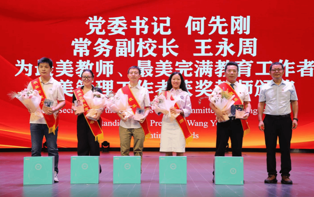 党委书记何先刚、常务副校长王永周为2023-2024学年“最美教师”“最美完满教育工作者”“最美管理工作者”教师授予荣誉称号并佩戴绶带。
