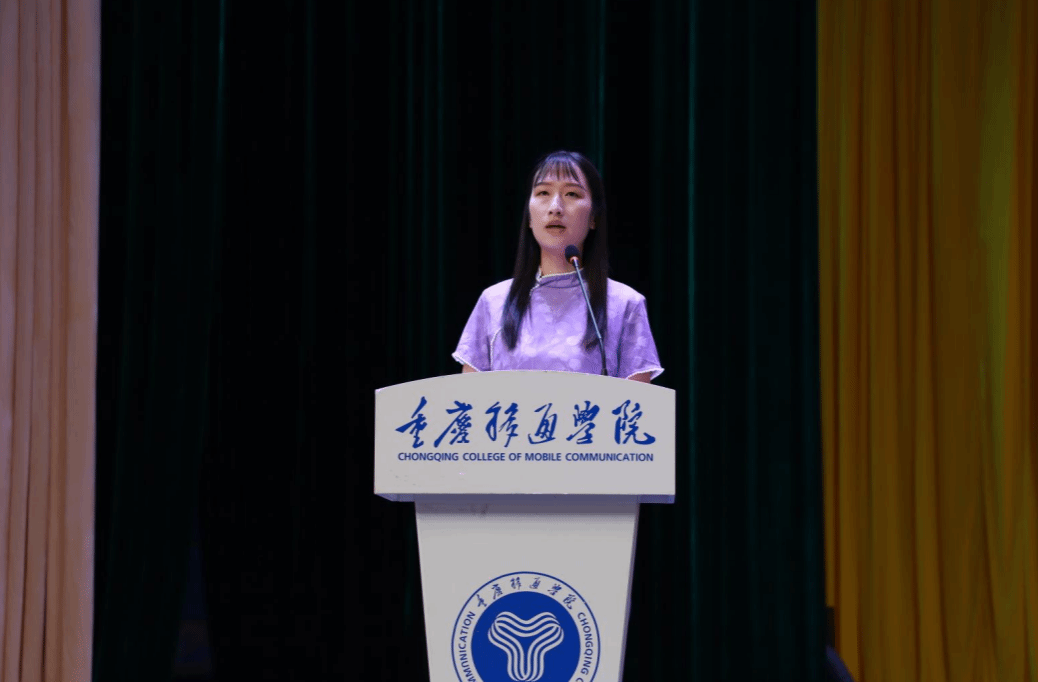 外国语学院天空书院2022级学生胡馨月代表全校学生向在场教师们表达祝福,并回顾了自己在移通学院的成长历程。“对于老师的形容词有很多,蜡烛、渡船、阶梯、灯塔……但在我们学生的心中,移通的老师们更是一群最可爱的人。是学生磨练意志的引路人、学习知识的引路人、创新思维的引路人、奉献社会的引路人。”