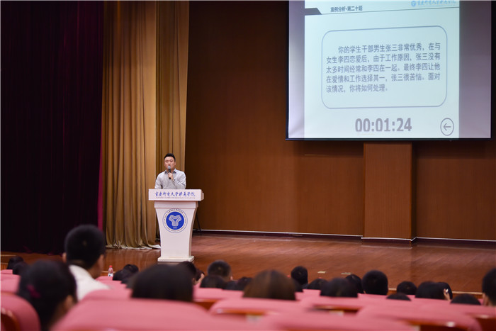 在完满教育主题演讲环节中,老师们根据自己对完满教育的认识与理解,进行了富有激情的演讲;在案例分析环节中,各参赛老师也仔细揣摩题目,根据以往学生工作经验与学生实际情况,层层分析,提出自己的想法与建议;最后一个环节是谈心谈话,通过学生情景模拟,再现了学生会干部竞选、宿舍矛盾、恋爱问题、宗教信仰等方面的问题,老师根据问题层层剖析,与学生进行了深入交流,师生双方的互动也博得了台下观众的阵阵掌声。