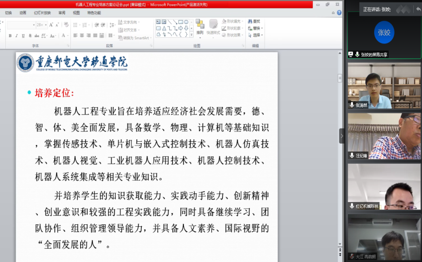 接下来,智能工程学院副院长党晓圆介绍了本次论证会举办的背景意义及论证内容。她讲到,智能工程学院于2018年11月获批立项建设重庆市普通本科高校新型二级学院,期望能够借助新型二级学院建设的机会和平台,认真研究适合我校实际的人才培养方案,在课程设置、实验室和实训基地建设、学生实践能力提高以及与产业对接方面制定切实可行的政策和制度,全面落实学校地方性、应用型办学定位,强化人才培养目标与社会、区域、产业经济发展需求相匹配的基础,确保新型专业与其他高校同类专业差异化发展,为新时代重庆经济社会发展提供强有力的人才保证、智力支持和科技支撑。教研室主任张涛然、张姣向与会专家分别介绍了2020级机械设计制造及其自动化专业和机器人工程专业人才培养方案初稿设置的人才培养目标、培养要求、课程体系、实践环节等情况。