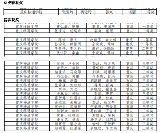 近日,在第八届“大唐杯”全国大学生移动通信5G技术大赛在北京落下帷幕,通信与信息工程学院学子在指导老师的悉心带领和精心准备下再创比赛佳绩。我校学子在省赛中荣获重庆市赛区一等奖2项,二等奖4项,三等奖16项。在全国总决赛中,郭爽、谌丽老师指导的张亚玲和杨运玲两位同学不畏强手、努力拼搏,斩获本科组全国总决赛三等奖。