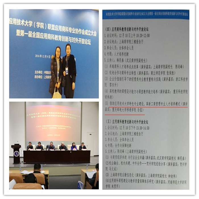 冬日的上海,海风习习,暖阳袭人。12月9日-11日,应用技术大学联盟应用商科专业协作会成立大会暨第一届全国应用商科教育创新与对外开放论坛在上海商学院举行,来自全国43所高校的近百位嘉宾聚于一堂,商讨应用商科专业协作会成立的大事,探讨在新的历史条件下商科高等教育发展面临的新任务。我校工商管理系系主任孙玺、财务管理教研室主任曾璐应邀参会。