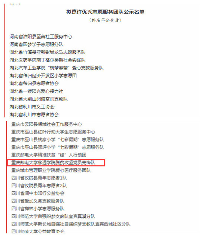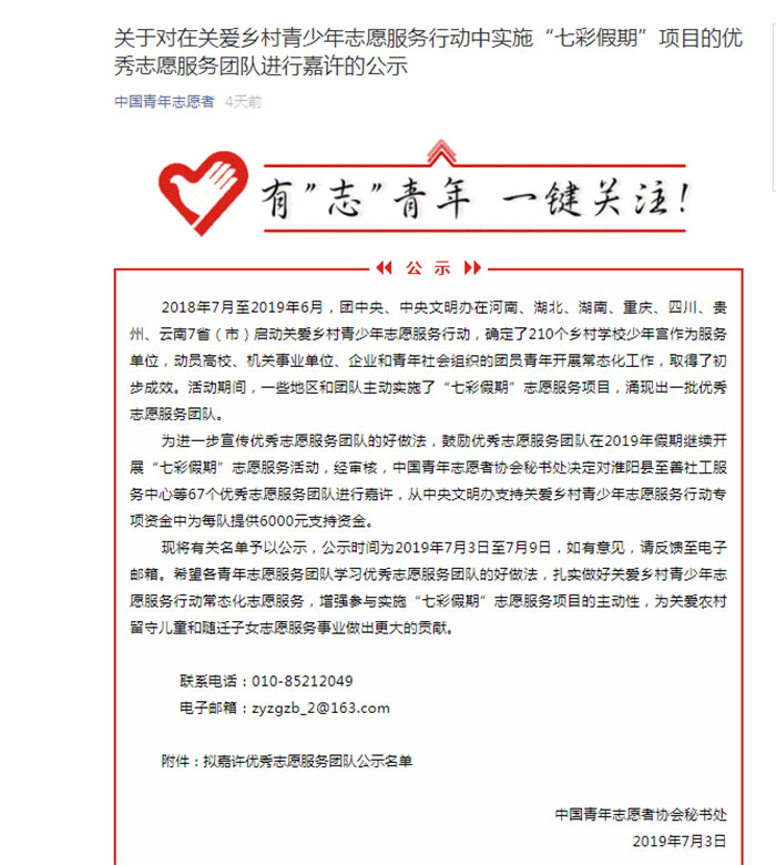 7月初,中国青年志愿者协会在官网公示了在关爱乡村青少年志愿服务行动中实施“七彩假期”项目的优秀志愿服务团队的表彰名单,并决定对淮阳县至善社工服务中心等67个优秀志愿服务团队进行嘉许,从中央文明办支持关爱乡村青少年志愿服务行动专项资金中为每队提供6000元支持资金,我校脱贫攻坚党员先锋队成为全国67个被嘉许的团队之一。