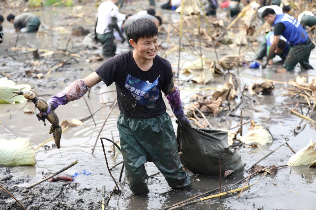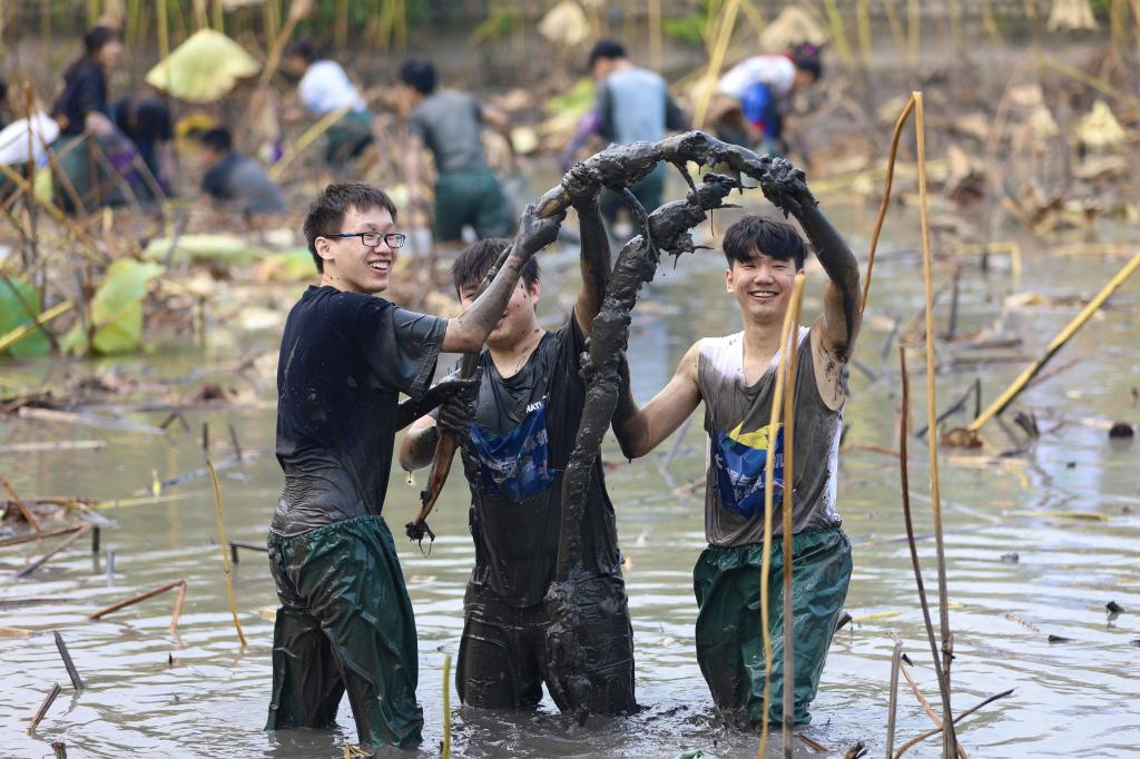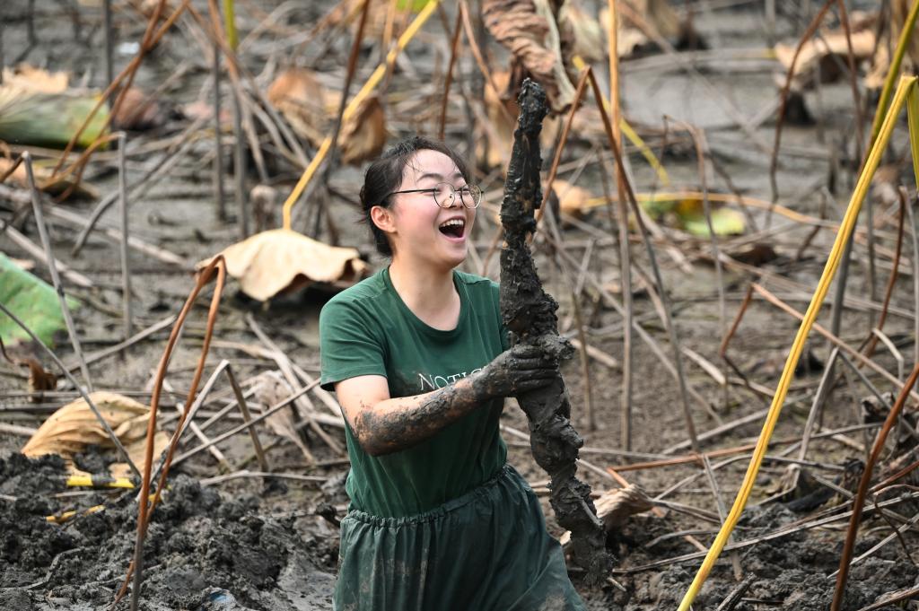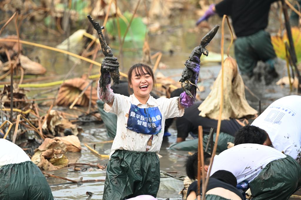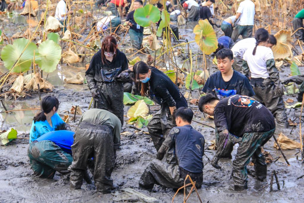 “虽已不是金秋九月,但有了荷塘文化节,十月依旧乐趣横生。”2022级鱼城书院通信与信息工程学院秦康迪说,作为一名刚进入移通的“大三新生”,没想到就和室友一举拿下了学校“炙手可热”的采藕名额,代表鱼城书院参与了此次荷塘大战。“与荷塘的初次过招,我险些被泥塘中散发出的怪味儿熏退,但不知何时起,我竟然与泥潭融为了一体,甚至还和队友一起,挖出了‘年度藕王’,这实在是一次跌宕、有趣的体验!同时,这也是我第一次接触此类活动,三小时的采藕体验让我从劳动中体会到了坚持的意义,与队友也迅速建立起了深刻的友谊,更让我感受到了一种‘被看见’、‘被关注’、‘被认可’的满足与欣喜,今日荷塘种种,我将永铭于心,继续成就更好的自己。”