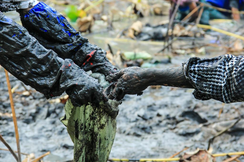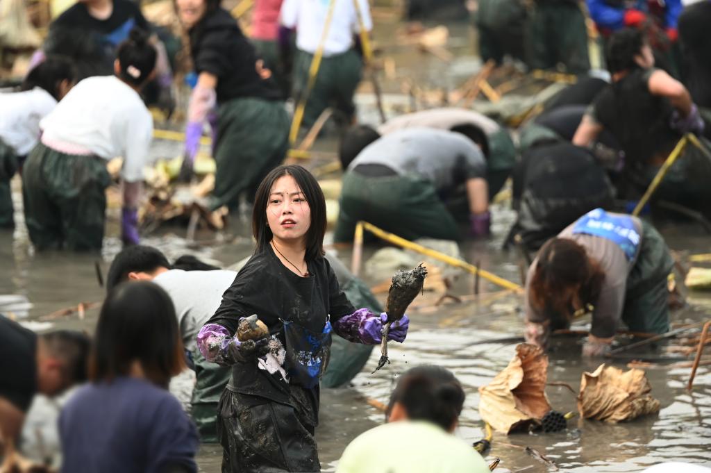 10月22日上午9:30,“荷叶田田·藕趣横生”第四届书院“家”校园荷塘文化节之“藕然心动”采藕大赛在全校师生的期待下再度回归,19支队伍气势昂扬、整装待发,共同奔赴这场“藕然之约”。活动现场,两百余名师生撸起袖子、穿上水裤、淌入泥塘、寻根采藕,有的不骄不躁、团队协作,有的玩趣大发、泥里撒欢,有的双手翻飞、干脆利索,在秋日荷塘里上演了一场速度与技术兼备的“藕王”争霸赛。最终,师生并肩作战,徒手采挖莲藕1725斤!鱼城书院代表队挖出的莲藕一根三支,完整保留了莲藕、藕带、荷叶三种形态,身长125cm、净重8.8斤,喜提“年度藕王”称号。