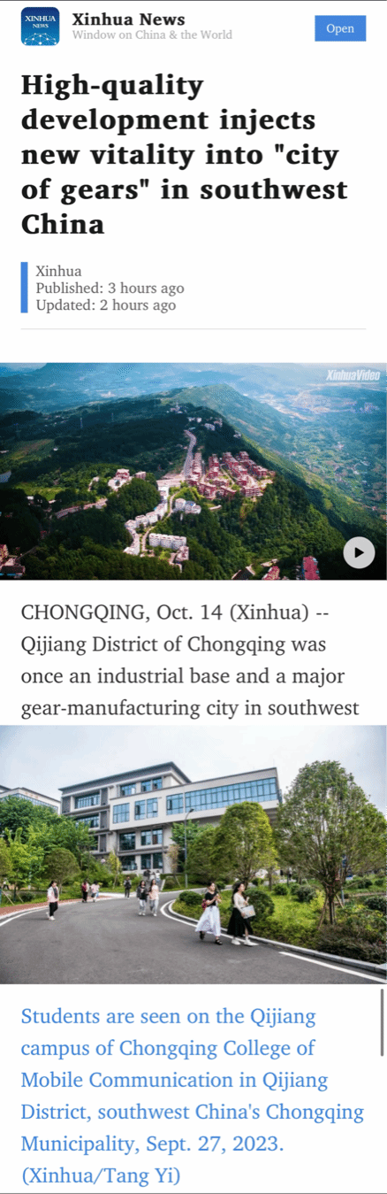 10月12日,新华社《新华每日电讯》中英版以《重庆綦江:老工业区如何迸发新活力》为题,对綦江区围绕产、人、城核心要素构建创新生态,打造“创新之城”进行了深度报道,报道中将我校綦江校区建设成果评价为綦江区建设发展有力支撑力量。