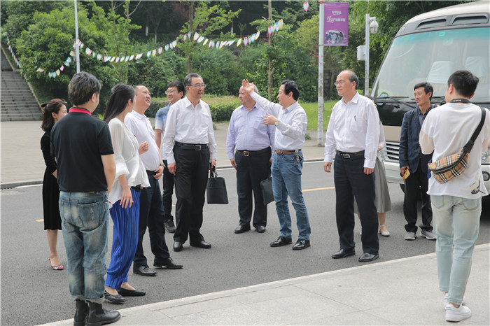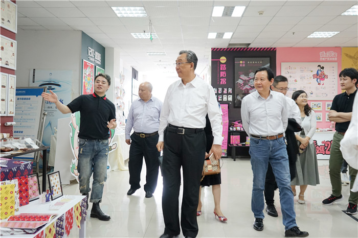 在张德民校长陪同下,王少鹏一行饶有兴趣地参观了广播电视编导专业、动画专业、数字媒体艺术专业的设计作品。在观看毕业生作品现场,他们不时与师生们交流作品的创意理念、制作过程,听取他们对作品内涵的阐释,亲自体验学生的设计作品。他们对此次大学生们在毕业创作中展现的社会责任、人文情怀、独特创意和艺术思考给予好评,对“社区导视图”系列、“罐头品牌设计”系列、虚拟VR系列更是给予高度评价。
