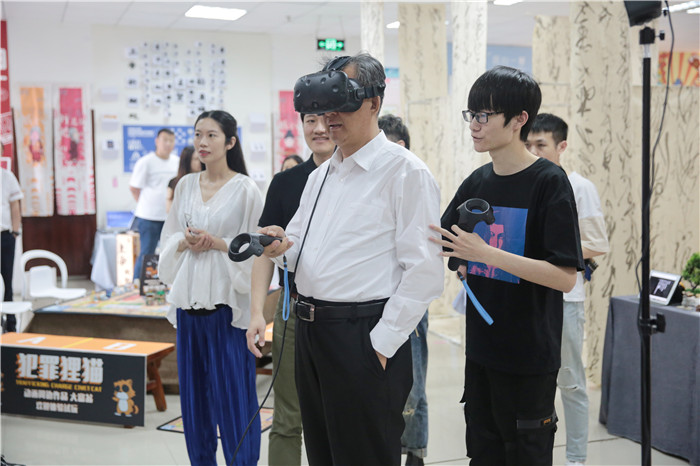 期间,张德民校长和山东科技党委副书记王少鹏一行现场体验了VR实景设计,他们对学生的创作理念表示肯定,提出艺术与科技的融合可以更好的促进专业发展及提升,饱含科技感的理念紧追时代步伐,与时俱进。
