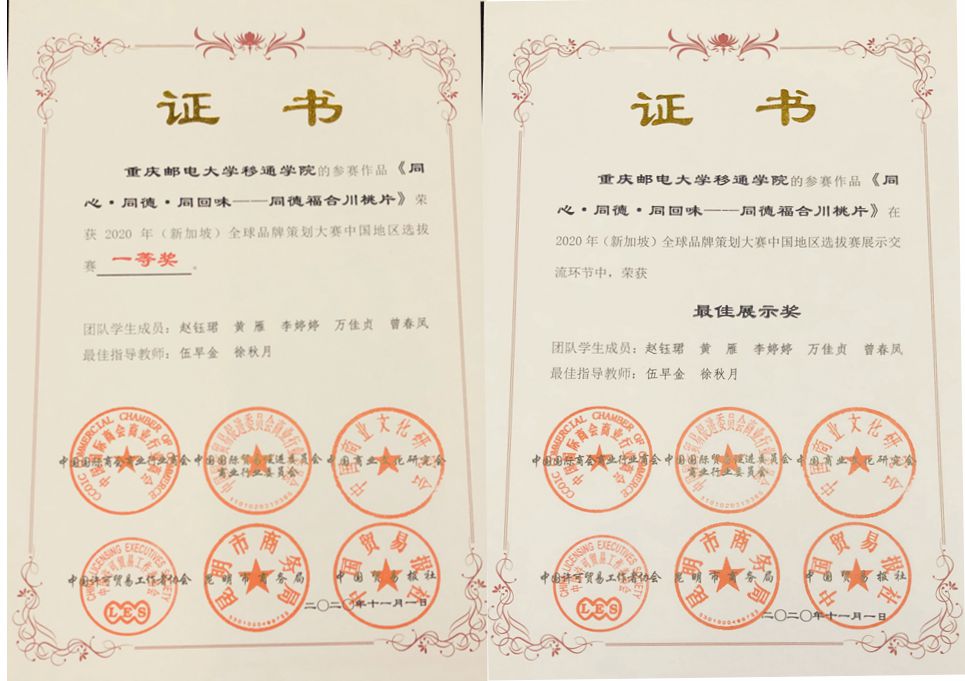 11月1日,2020年(新加坡)全球品牌策划大赛中国地区选拔赛国赛决赛颁奖典礼于云南省昆明市云安会都大酒店正式举行。由伍早金、徐秋月两位老师指导的北山书院“桃韵味品牌策划工作室”团队作为我校唯一入围的团队成功斩获国赛一等奖、展洽会“最佳展示奖”两个荣誉。