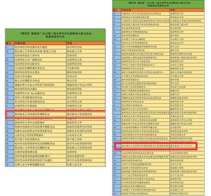 近日,由共青团中央网络影视中心、未来网主办,未来社团承办的“燃青春,聚能量”2018年第三届全国学生社团影响力展示活动落下帷幕。我校学生社团联合会鼓励各级各类社团参与申报,在全校师生齐心协力的努力下,我们以丰富全面的申报材料斩获八项荣誉称号,成为重庆市各高校中获奖数最多的高校。