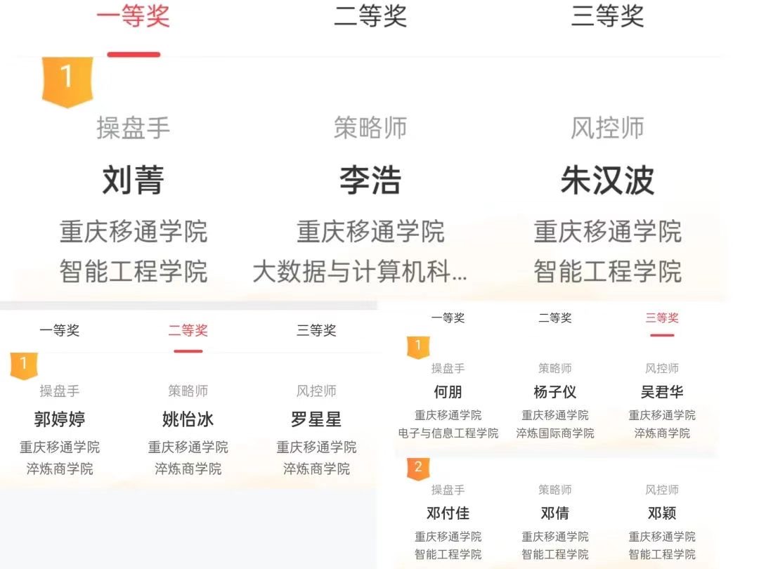 “熊肝虎胆尚铄今,捷报纷飞传佳讯”。在前期宣传工作结束后,千余名移通学子争相报名参赛,与全国各地高校学子一同捭阖股市,经过一个月角逐百余名参赛选手脱颖而出晋级省赛并完成组队,从校赛,省赛,一路闯进国赛。最终我校在国赛中斩获1个一等奖、1个二等奖和2个三等奖,她们分别是“移通股神”、“GYL417”、“十年中三千稳中向好”和“omygod小神经”;共有48支队伍在省赛中斩获9个一等奖、13个二等奖和26个三等奖。荣誉或许只是一张证书,但选手在比赛过程中收获到的经验,学习到的金融知识,提高的实践能力却是千金不换的。
