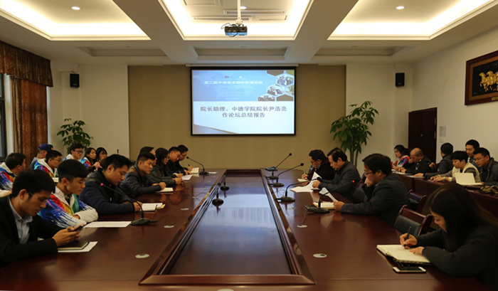院长助理尹浩亮在总结报告中说道:“这是我校第二次举办该项活动,同第一届相比有了很大变化,虽个别细节还有待下次改进,但总体而言,经过大家全力配合,论坛取得了圆满成功。”并依次从论坛官网、媒体宣传、会务组织等六个方面进行了详细汇报。在论坛召开期间,论坛官网新增注册报名系统,减少了前期的繁琐。设立了专门的新闻媒体区,到场媒体有二十多家,新浪微博还进行了全程直播。本届论坛出了两本专著,较上届翻一倍。接待工作更加细致,新增短信提示和机场接待等服务。对突发情况能及时解决,组织到位,认真负责。志愿者积极参加,志愿者服装也很有特色。同时他也指出存在的不足,例如报名系统细节存在漏洞,志愿者培训有所不足,翻译和提示牌的准确度有待提升等问题。