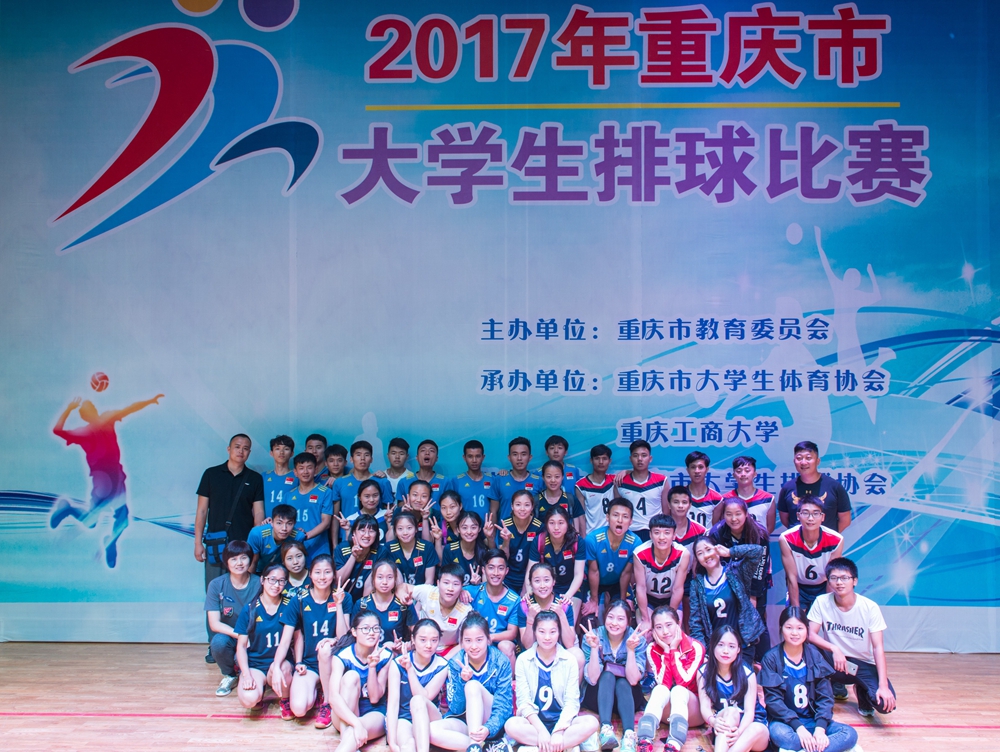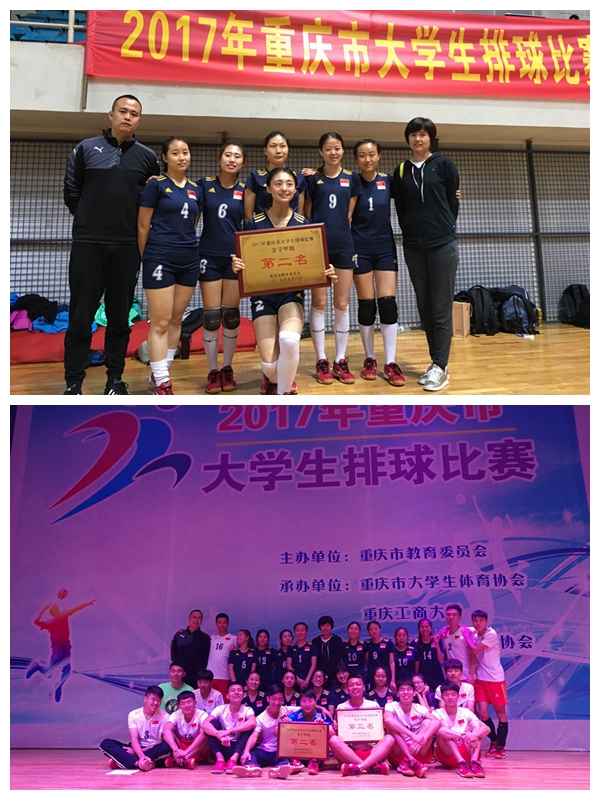 春末夏初,伴着淅淅沥沥的小雨,5月2日,2017年重庆市大学生排球比赛在重庆工商大学隆重举行。来自重庆的23所高校37支队伍参加比赛,运动员人数达400余名。我校派出男女各一支队伍参赛,在为期五天的比赛中,我校男、女队在本次比赛中奋勇拼搏,大放光彩,分别获得女子甲组第二名和男子甲组第三名的优异成绩。我校男排队员杨朋、赖科材与女排队员乐荣、靳彩虹在本次比赛中均获得“精神文明运动员”称号。男、女排教练员分别获得“优秀教练员”称号。
