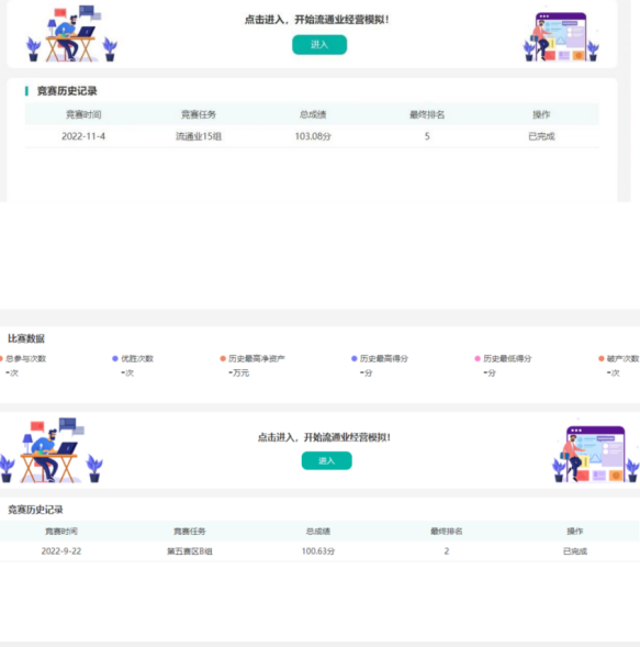 流通业模拟竞赛是以真实商贸流通企业为背景,参赛选手组成对抗小组,在模拟复杂多变的市场环境下,寻找不同类型供货商采购商品,通过连锁店铺和网络店铺进行销售,获取产品增值与利润。比赛需要学生将所学到的管理、电子商务、、财务管理、市场营销调研等专业知识充分运用起来,既有效的锻炼了学生们的思维能力与组织能力,也锻炼了学生们的竞争意识与风险能力。