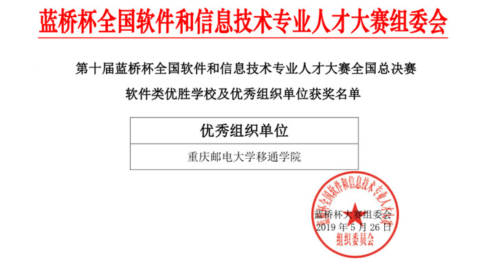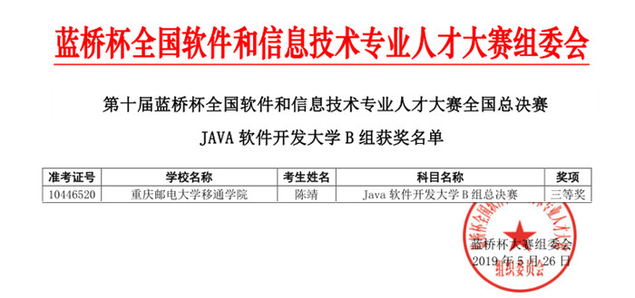 5月25日,第十届“蓝桥杯”全国软件和信息技术专业人才大赛总决赛在北京大学、首都经济贸易大学等赛点共同展开,来自北京大学、清华大学、北京航空航天大学、上海交通大学、华中科技大学等几百所高校的近6000名顶尖选手汇聚北京,争夺蓝桥杯桂冠。我校双体系航天赛博定制班学员陈靖(大数据与软件学院2015级软件工程专业)作为重庆市赛一等奖选手,代表我校参加了软件类Java B组决赛,并获得全国三等奖,我校也获得总决赛优秀组织单位奖。