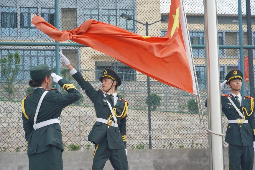 首先,全体起立面向升旗台,升国旗、奏国歌。