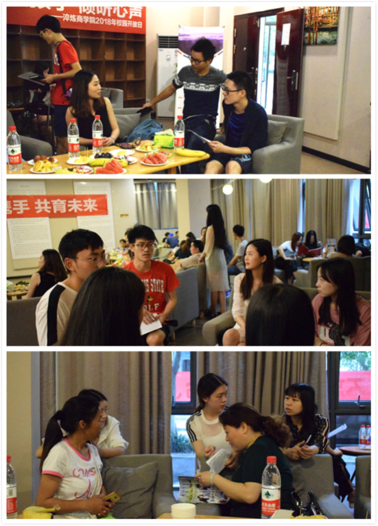 教工咖啡厅里淬炼商学院辅导员们和家长们进行着深入的交流,家长们坦诚得说出自己孩子存在的一些问题,和辅导员共同探讨如何改进,并毫无保留地称赞表扬自己孩子在大学的改变和成长,敞开心扉地交谈自己孩子所处的生活环境,结交的朋友伙伴。各位辅导员也耐心仔细地回答、讲解家长们的疑惑。