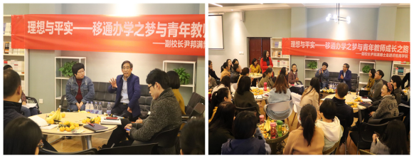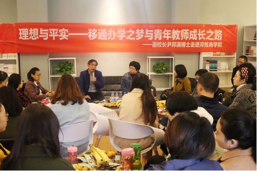 鉴于此,淬炼商学院于11月7日在5教5楼商学院图书馆开展了以“理想与平实--移通办学之梦和青年教师成长之路”为主题的座谈会。学校副校长尹邦满博士亲临现场,与商学院副院长秦春蓉、副院长谢银平以及全体教师、辅导员一起,就学校的发展、办学理念、教师成长、专业教学与完满教育结合、教育教学方法等进行了深度交流。