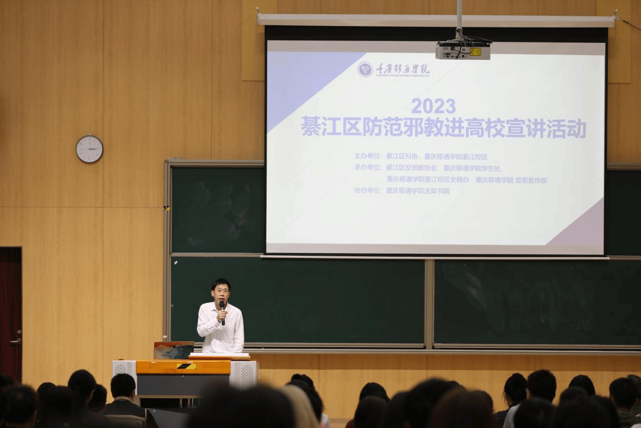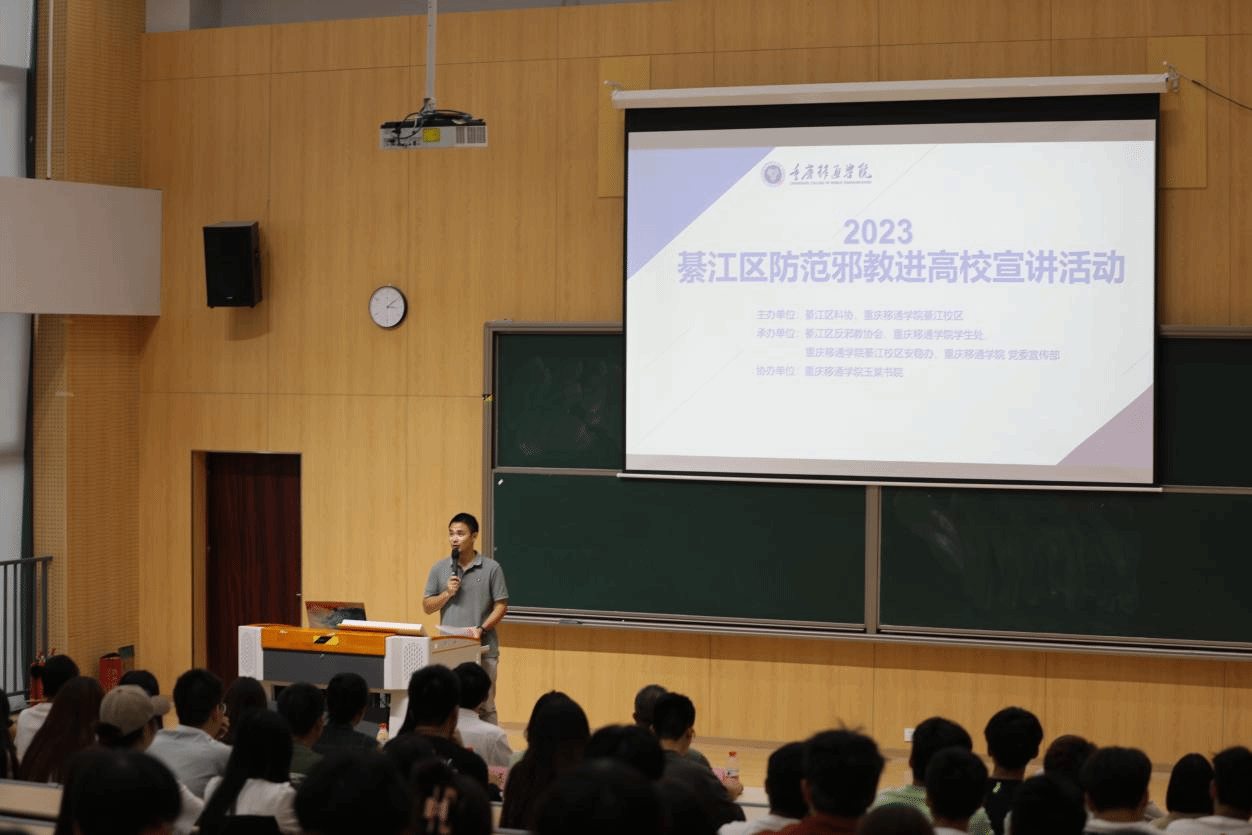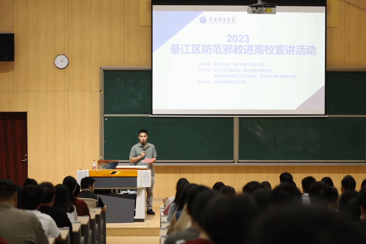 为提高广大青年师生认清邪教、辨识邪教、抵制邪教的能力,营造崇尚科学、倡导文明、增进健康、反对邪教的校园氛围,重庆移通学院于9月20日下午在綦江校区玉棠书院阶梯教室正式召开高校反邪教宣讲活动。