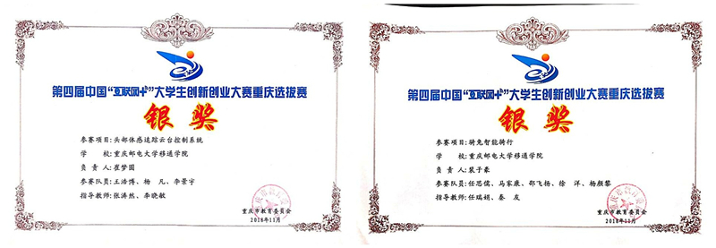 我校“骑兔智能骑行”、“头部体感追踪云台控制系统”2个项目获得大赛重庆赛区主赛道银奖,得到评委的一致好评;“重庆联方云科技有限公司”、“3D云工厂”、“锄禾优品(红色赛道)”三个项目获得大赛重庆赛区铜奖;“小跟班智能出行”、“型走个性化旅游”、“城市蜂巢”等11个项目获得大赛重庆赛区优秀奖。