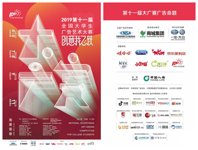 全国大学生广告艺术大赛是由中国高等教育学会、教育部高等学校新闻传播学类专业教学指导委员会主办,自2005年第一届大广赛至今,遵循“促进教改、启迪智慧、强化能力、提高素质”的竞赛宗旨,成功举办了十一届十二次赛事,全国1400多所高校参与其中,数十万学生提交作品。发挥了大学生群体的智慧和创造力,培养了大学生的创新意识和解决问题的能力,展示了新一代大学生的学识水平和精神风貌,是迄今为止全国规模最大的、覆盖面广、参加院校多、参加师生人数多、参赛作品水平高的全国性大学生赛事。