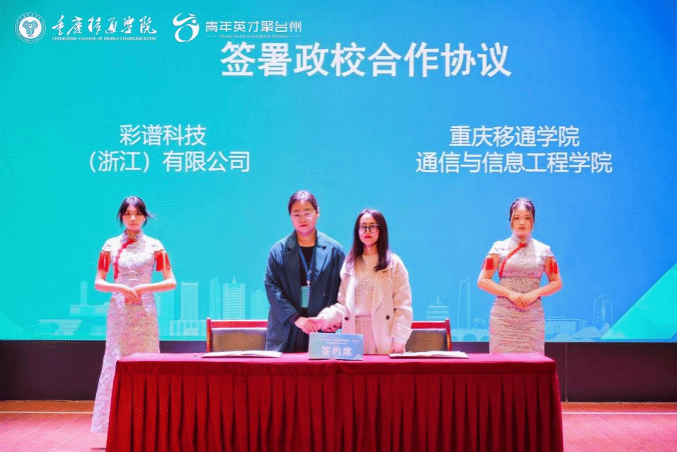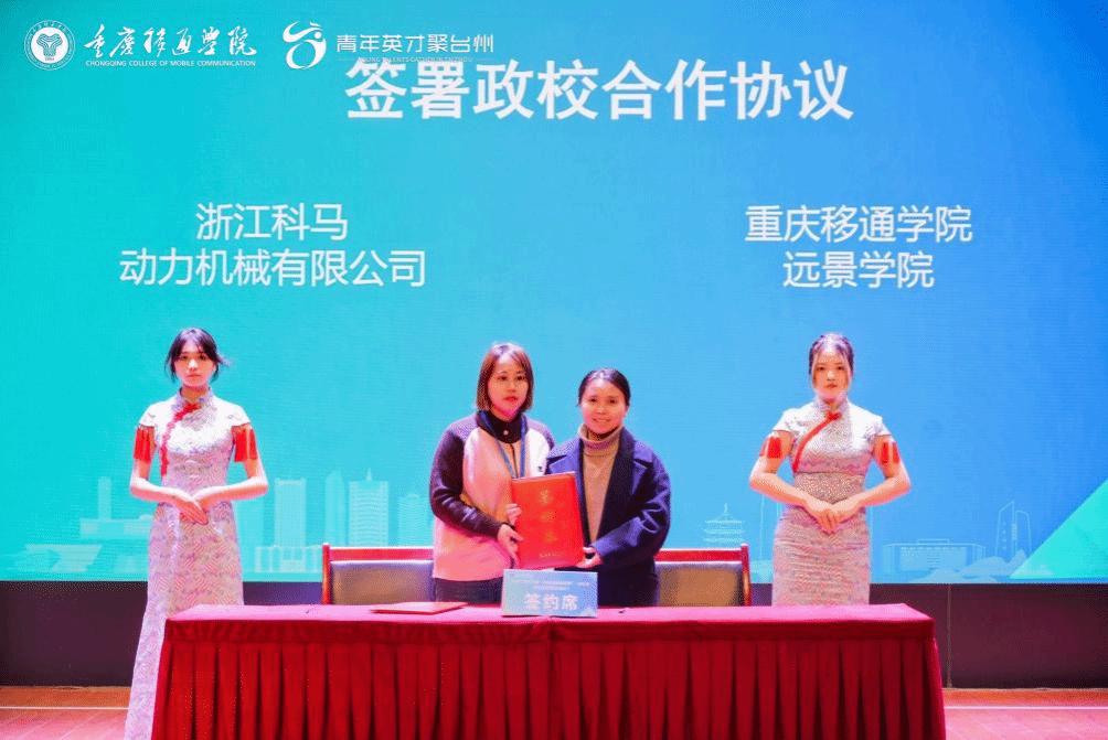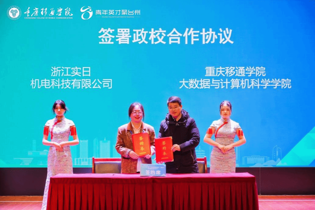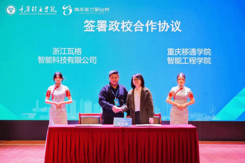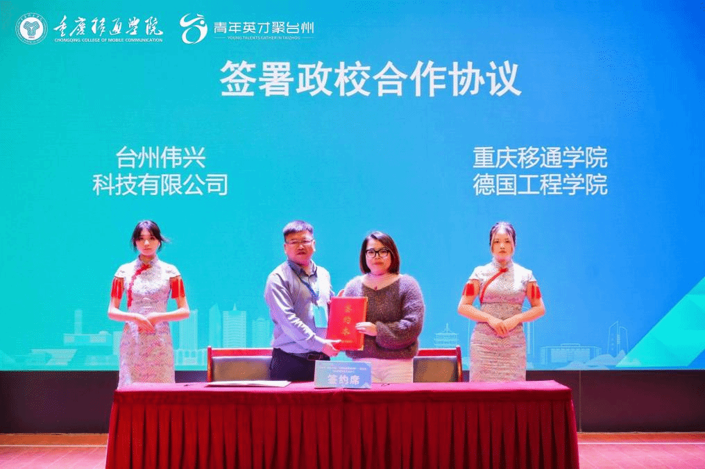 重庆市大学中专毕业生就业指导服务中心党支部书记、主任唐雪平,台州市路桥区人力资源和社会保障局党组成员、副局长徐玮玮,我校副校长陈仲华、台州伟兴科技有限公司陈挺、我校智能工程学院院长党晓圆共同上台按下政、校、企合作启动键,各企业代表分别与我校签订合作协议。