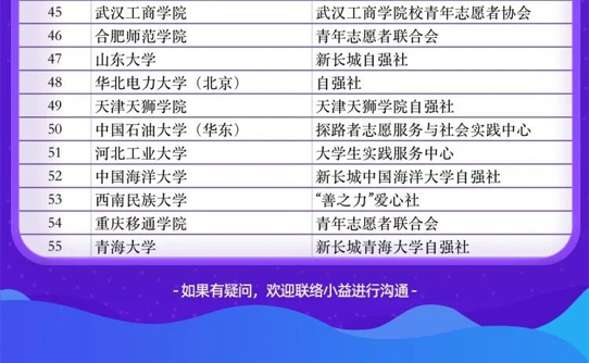 我校累计已承办3次“公益未来•玛氏箭牌”相关赛事,共计213支队伍参与,受益人数达3754人次。在疫情下,2020-2021学年我校以‘线上+线下’的方式展开相关赛事,积极鼓励学生组织队伍参与答辩,并借助移通晓英才、青年志愿者联合会官方QQ、志愿移通等多个宣传平台打响公益环保战役,呼吁大家积极以智创新,以动公益。