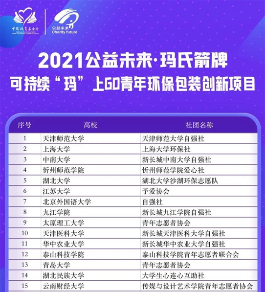 近期,我校青年志愿者联合会成功入选由中国扶贫基金会、玛氏箭牌糖果(中国)有限公司发起的2021公益未来•玛氏箭牌可持续“玛”上GO青年环保包装创新项目。今年,玛氏箭牌包装可持续活动将继续在我校开展,且活动形式、高校支持、传播推广等方面进行了创新和升级。